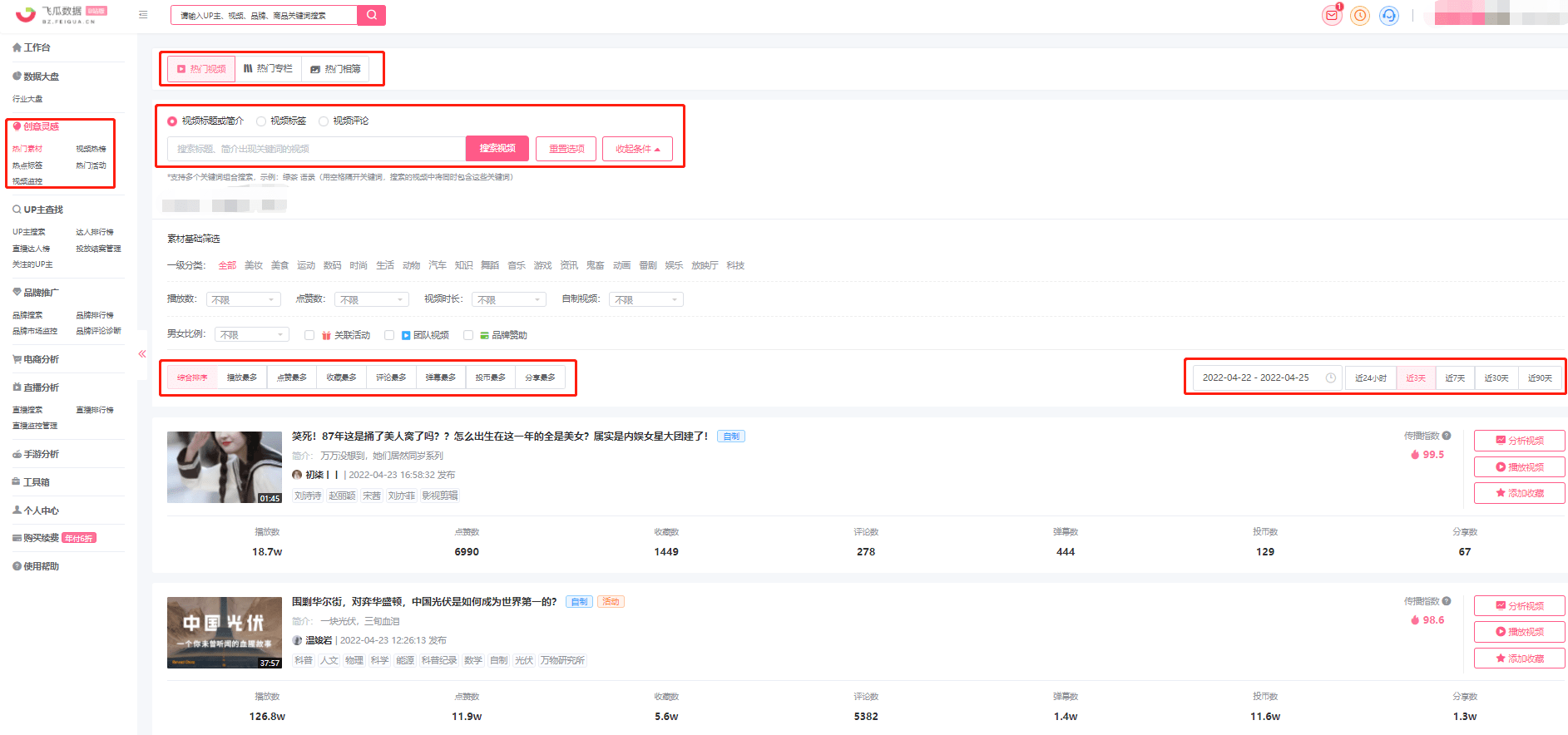 热门视频可以根据视频视频标题或简介、视频标签、视频关键词评论进行搜索视频,搜索呈现的视频除了按综合排序外,还可按播放最多、点赞最多、收藏最多、评论最多、弹幕最多、投币最多、分享最多进行查看,结合热门视频的时间范围筛选,可以实现近24小时、3天、7天、30天、90天,也可以获取自定义时间日期范围的B站热点视频素材资料!