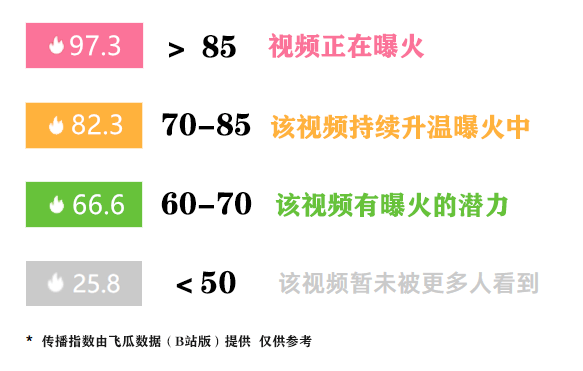 ①根据每个视频对应的传播指数的高低进行选择,传播指数是根据UP主的粉丝数、视频点赞数、播放数、投币数、分析数等分析出来的综合得分。数值越高,上B站热门的几率就越大,粉色表现最佳,依次是橙色、绿色、和灰色。