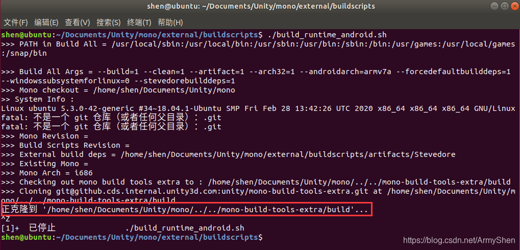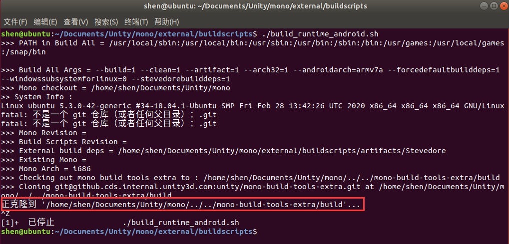 <5.1>第一次执行的时候,会提示克隆mono-build-tools-extra这么一个文件,但貌似仓库已经没有这玩意儿了,这时直接Ctrl+Z强制结束就行了。