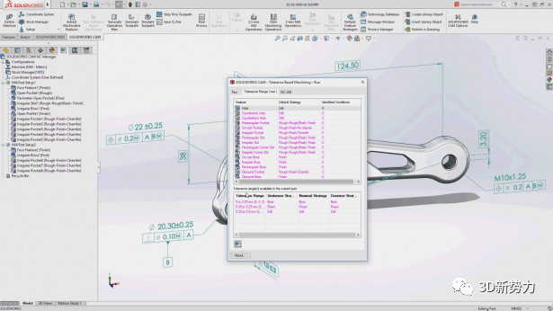 3.SOLIDWORKS-CAM:为了充分利用智能标注,SOLIDWORKS-CAM可以根据SOLIDWORKS-MBD定义的三维标注尺寸公差,实现加工设置、策略和数控编程的自动化。图5显示了公差基准加工。