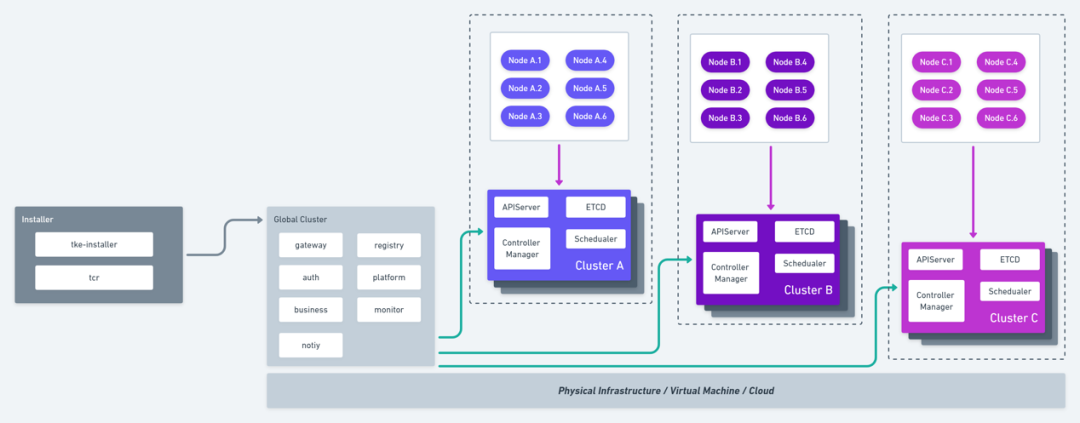 Installer:运行 tke-installer 安装器的节点。负责提供 Web UI 来指导用户在 Global 集群部署TKEStack控制台。