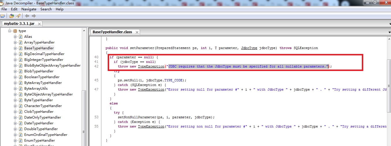 在项目过程中,执行sql,报“JDBC requires that the JdbcType must be specified for all nullable parameters.”,查看源代码,发现来源于mybatis-XXX.jar的org.apache.ibatis.type.BaseTypeHandler.class,如下图: