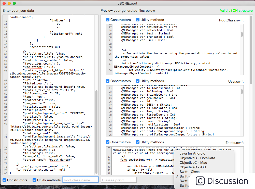 支持JSON文件直接导出为开发中使用的Model类型。支持Java,Objective-C,Swift等语言的数据模型。