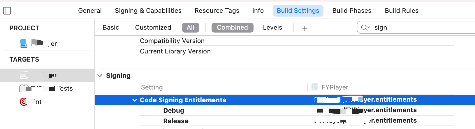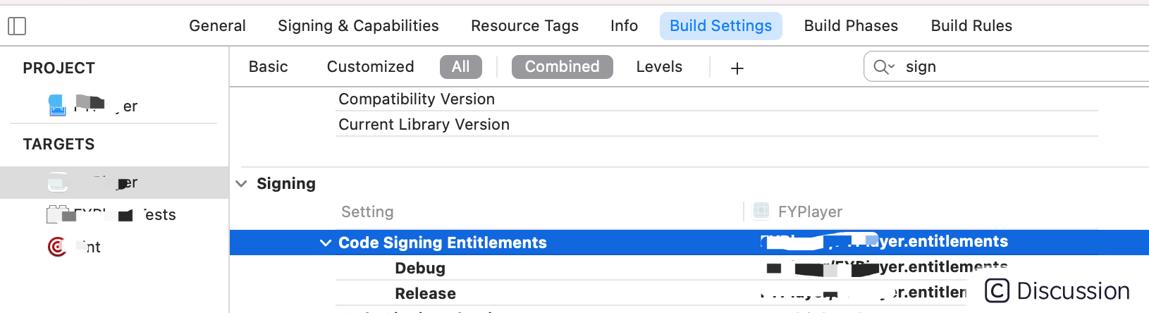 我们可以Copy原来的授权文件,重命名,然后在Build Setting > Signing > Code Signing Entitlements中配置刚才新增的entitlements文件。