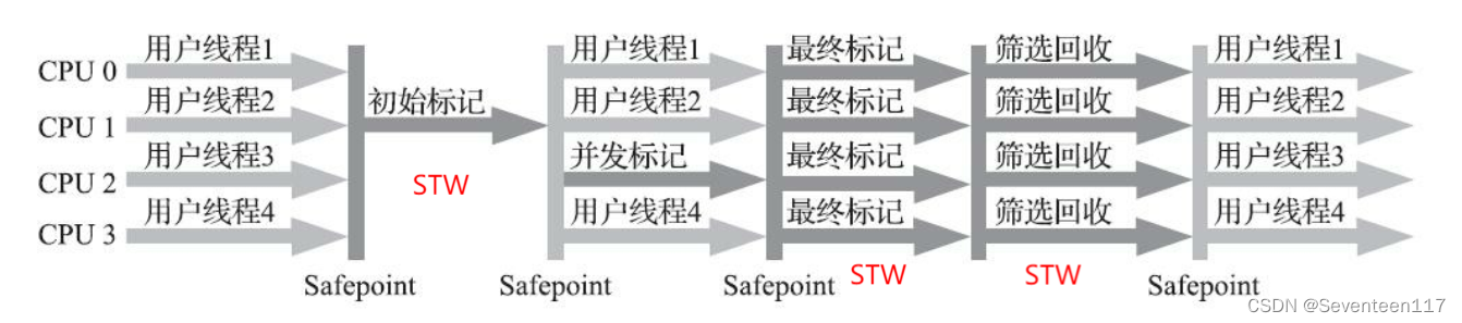 - 初始标记(initial mark,STW):暂停所有的其他线程,并记录下gc roots直接能引用的对象,速度很快 ;