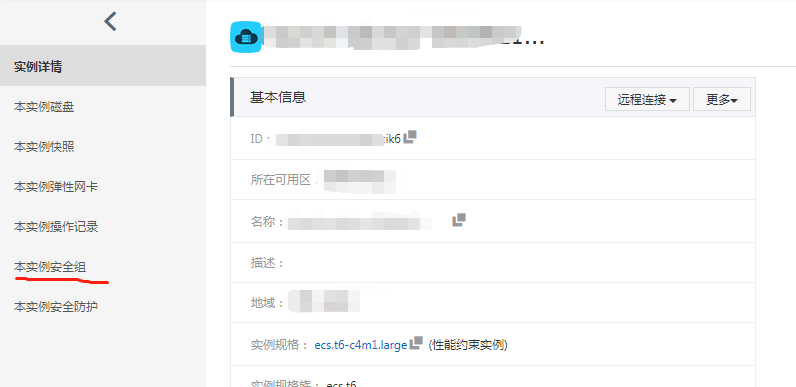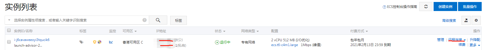 购买云机器后,可以在ecs实例页面查看你的机器,注意图中划红线的部分内容: