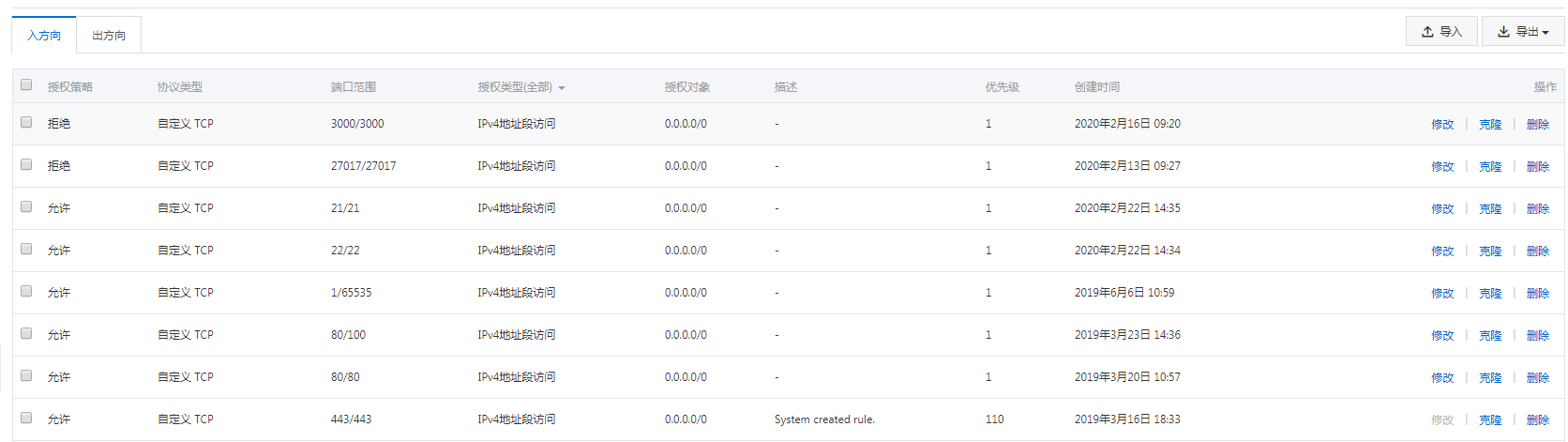 这里的端口配置决定了外网能否通过这些端口访问你的机器,默认设置是把常用端口都打开的,如果在操作的过程中发现在外网无法访问你的机器,首先要做的就是检查实例安全组端口配置。在实例功能部署完毕后,建议把除了80和443之外的所有端口都禁掉,保证机器安全。笔者的mongodb服务的数据库就是因为没有关闭27017端口,被黑过好几次,这里建议大家提高警惕。