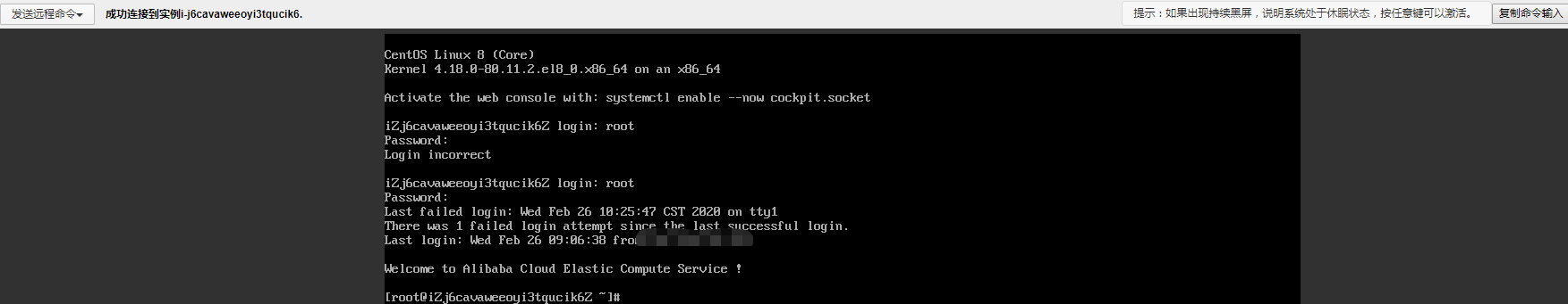 $ ssh root@xx.xx.xxx.xxxWelcome to Alibaba Cloud Elastic Compute Service !Activate the web console with: systemctl enable --now cockpit.socketLast failed login: Tue Feb 25 19:22:36 CST 2020 from xx.xxx.xx.xxx on ssh:notty