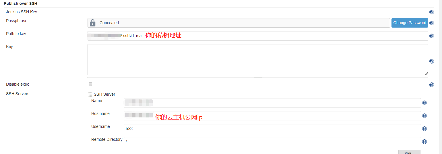 jenkins安装好之后,需要安装git等等配合的插件,方便后续流程。为了让jenkins能够远程登录云主机执行命令,我们需要在jenkins的系统配置里添加本地私钥和云主机的ip地址: