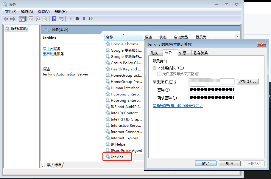 执行windows commond时,如果ssh相关服务报没有权限,可以运行services.msc, 选择jenkins服务,设置登录的用户为本机用户: