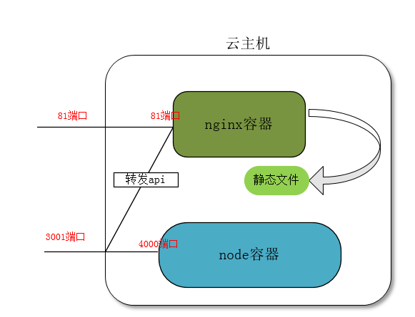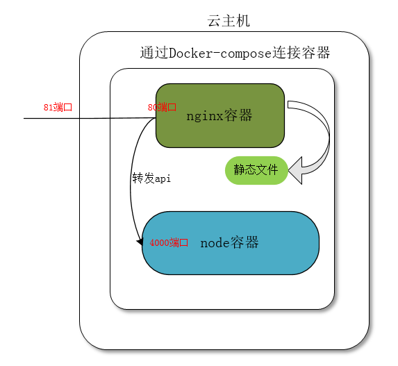 现在我们可以通过81端口访问服务了,因为nginx将api请求给我们代理到了docker容器中。如果访问81端口下的根目录,就可以看到你部署的静态站点。我们用一张图来描述当前的架构: