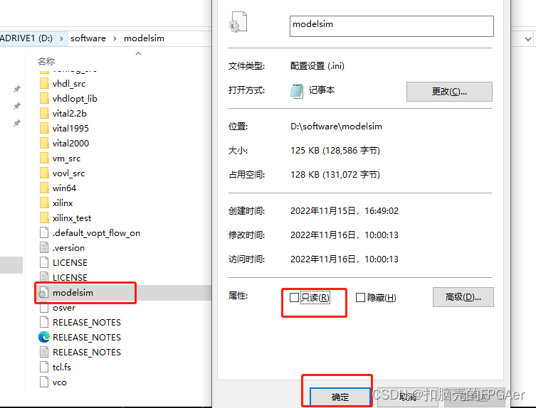 找到modelsim安装路径下的modelsim.ini文件,取消modelsim.ini的只读属性: