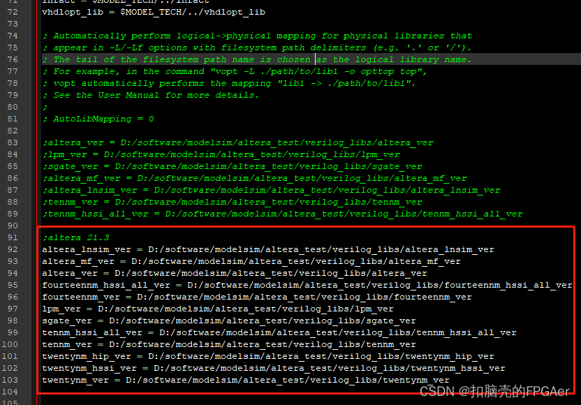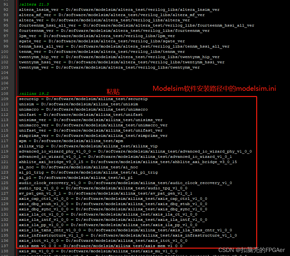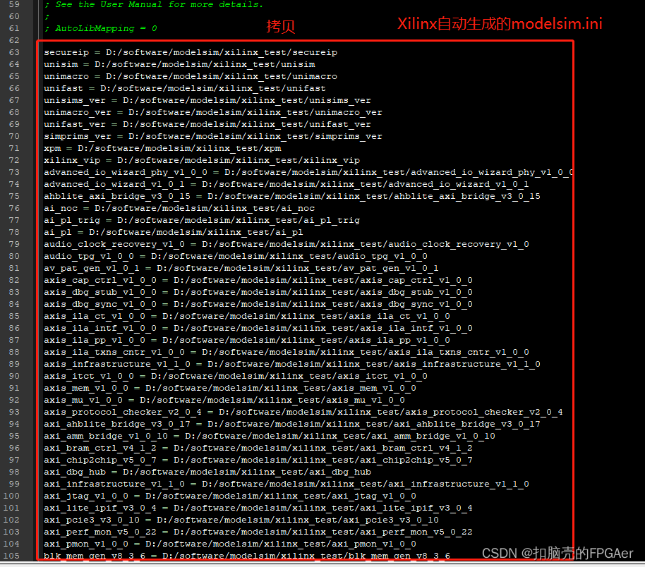 可以看到Xilinx自动给我们在它的路径下自动生成了一个modelsim.ini,该文件中已经加载了Xilinx的器件库,我们只需将它里面的器件库路径复制出来,拷贝到Modelsim软件安装路径中的modelsim.ini中即可: