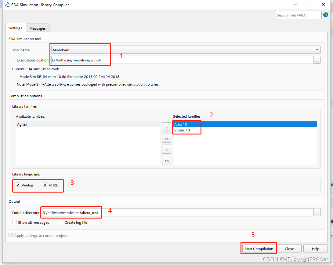 以A10和S10器件为例,在1中选中Modelsim的win64路径;在2中选入A10和S10器件;在3中选择库的语言,默认Verilog和VHDL全选;在4中选择编译库所在路径,这里直接将编译库存入Modelsim的路径中;在5中点击Start Compilation。