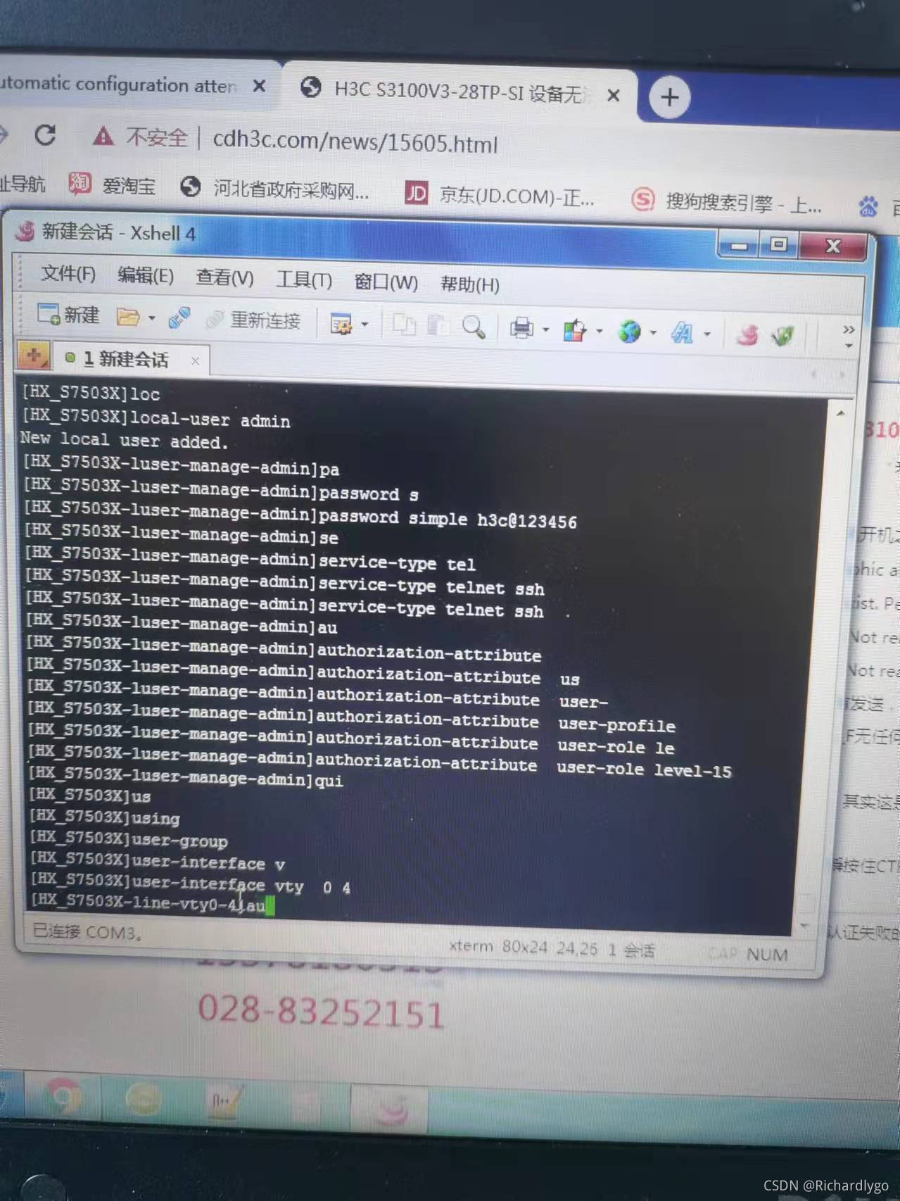 笔记本通过consloe 口连入交换机,默认用户名admin,默认密码admin@huawei.com,首次登陆强制更改密码。