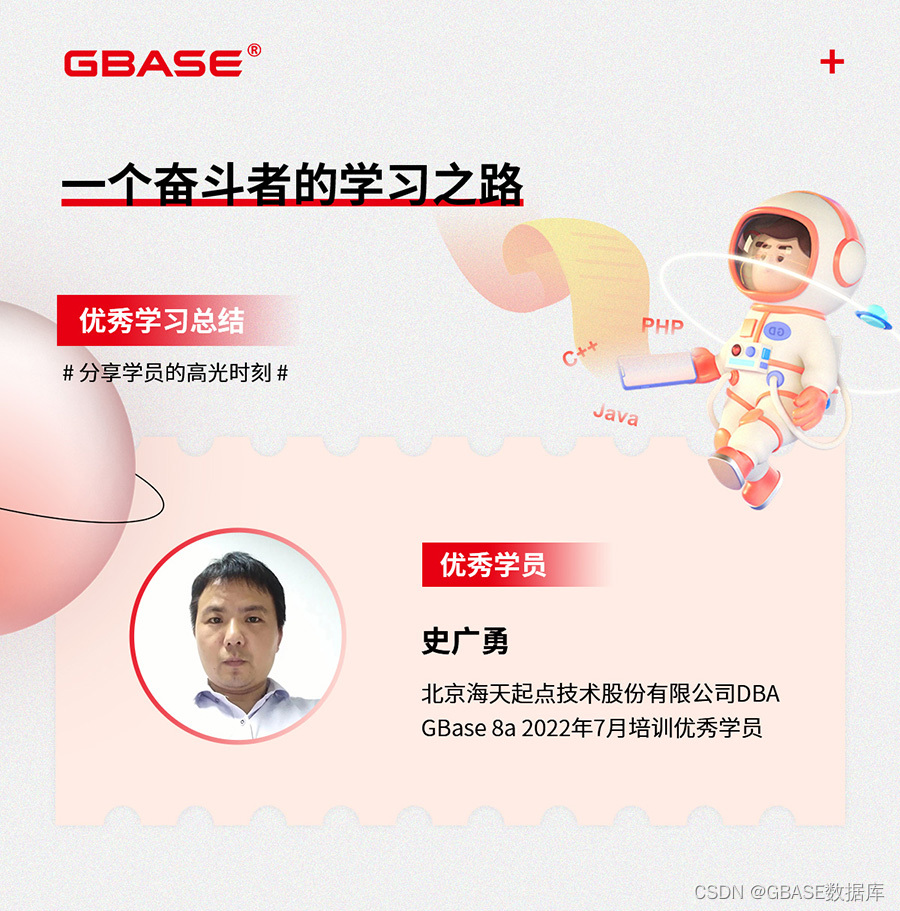 参加GBase数据库的培训的原因,一是为了国产数据库在国内市场占有率很高时,使自己能够紧跟时代的步伐;二是为了支持一下国产数据库,我会为国产数据库的崛起而感到自豪的。