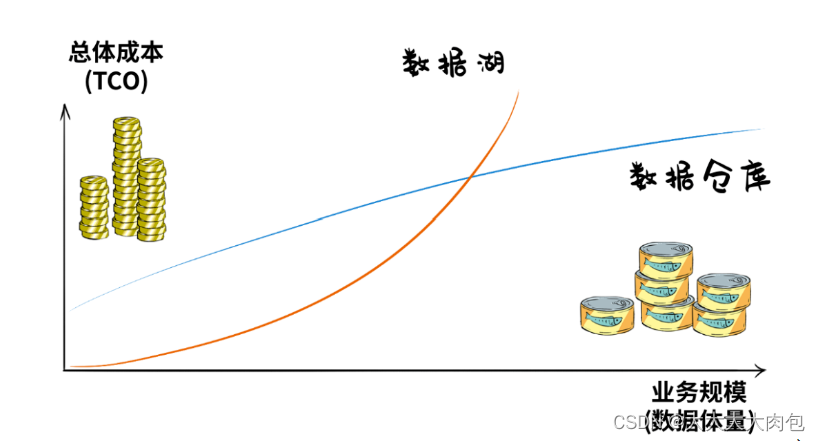 数据湖起步成本很低,但随着数据体量增大,TCO成本会加速飙升,数仓则恰恰相反,前期建设开支很大。总之,一个后期成本高,一个前期成本高,对于既想修湖、又想建仓的用户来说,仿佛玩了一个金钱游戏。