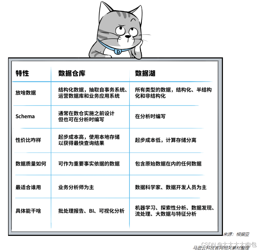 从数据含金量来比,数据仓库里的数据价值密度更高一些,数据的抽取和Schema的设计,都有非常强的针对性,便于业务分析师迅速获取洞察结果,用与决策支持。而数据湖更有一种“兜底”的感觉,甭管当下有用没有/或者暂时没想好怎么用,先保存着、沉淀着,将来想用的时候,尽管翻牌子就是了,反正都原汁原味的留存了下来。
