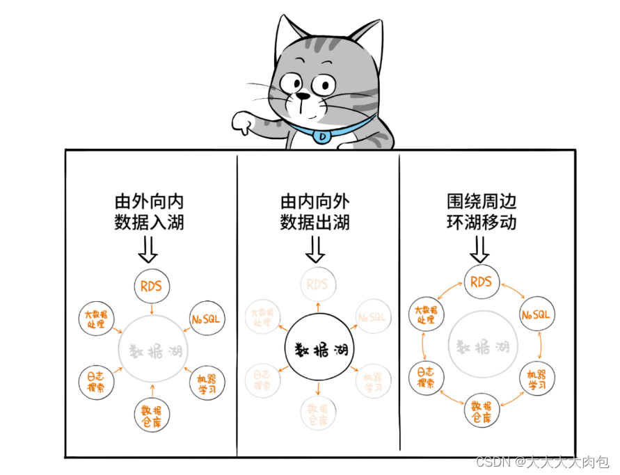 大家“环湖而饲”,既可以直接操纵湖内数据,也可以从湖中摄取数据,还可以向湖中回注数据,同时环湖的服务彼此之间也可以轻松交换数据。