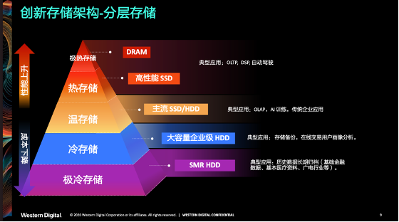 第一,是分层存储,指的是在“存储金字塔”中根据应用场景的不同划分为五层,从低到高依次为:极冷存储、冷存储、温存储、热存储和极热存储,通过为每个分层提供差异化的产品以满足不同的需求,最终满足客户的实际需求。(参考:《西部数据:再定义分层存储架构,赋能数据中心新基建》)