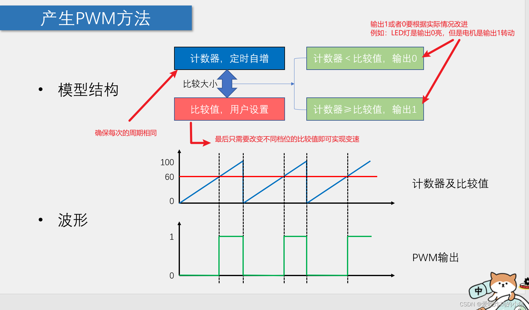 类似的应用还有我们手机上的呼吸灯,也是采用了PWM的技术,我们控制不同的占空比来实现灯的亮度不同,而要实现从亮到暗,那么就要在规定的时间内改变比较值的大小,从而使占空比也随时间的变化而变化。