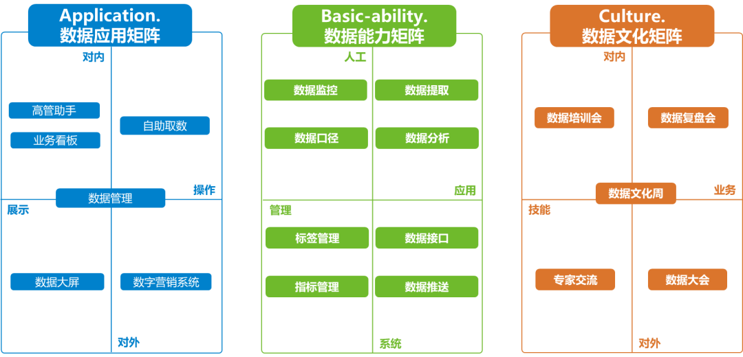 “所谓ABC矩阵,是构建数据应用(application)、数据能力(basic-ability)、数据文化(culture)矩阵,通过数据看板、数据提取、数据分析、数据接口等手段,提升对业务增长的数据赋能,是数据团队价值的实现路径。”