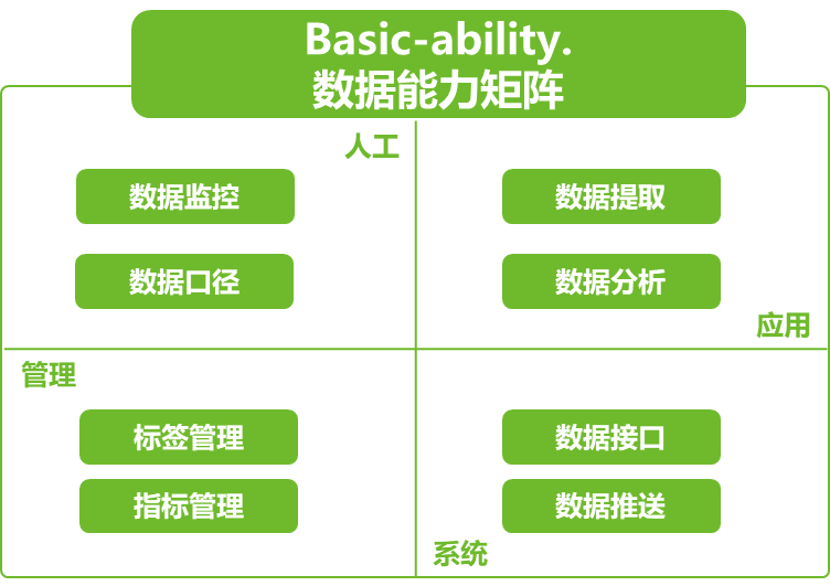 “你可以这么理解,有了锅有了铲,就做出来披萨了吗?我们知道,实际上并没有。所以接下去我要讲到数据价值实现路径的第二个矩阵,数据能力矩阵(basic-ability)。简单而言,就是告诉对方,我们能做什么?我们是披萨店,我们能提供披萨,也提供鸡块、饮料;我们是数据团队,可以提供数据。提供什么样的数据?通过什么样的方式提供?如何进行这些数据的管理?我们可以根据两个维度,一个是偏向人工或者偏向系统,另一个是偏向管理或者偏向应用,来进行数据能力,或者说是基础能力的划分。”