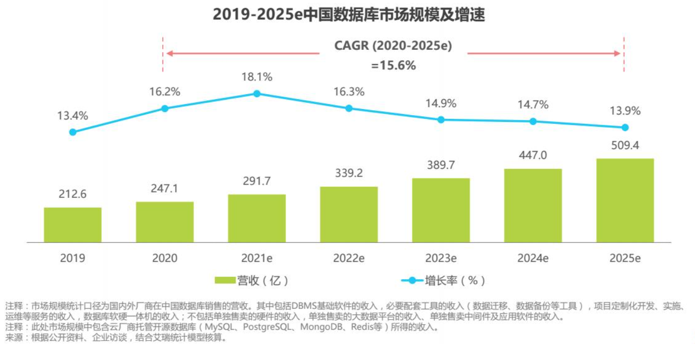 《2021年中国数据库行业研究报告》中指出,“政策和数字化持续释放需求,中国数据库市场进入百花齐放的快速发展期。2020年,国内数据库市场总规模达247.1亿元,较2019年增长16.2%,CAGR(2020-2025e)达15.6%,未来三年预计将保持高增长。国产数据库在分布式改造、国产化、数据迁移、跨库管理、软硬结合等多方面仍面临挑战,湖仓一体、DBaaS等五大趋势将成为中国数据库市场未来发展的必然趋势。”