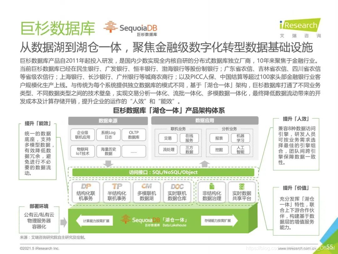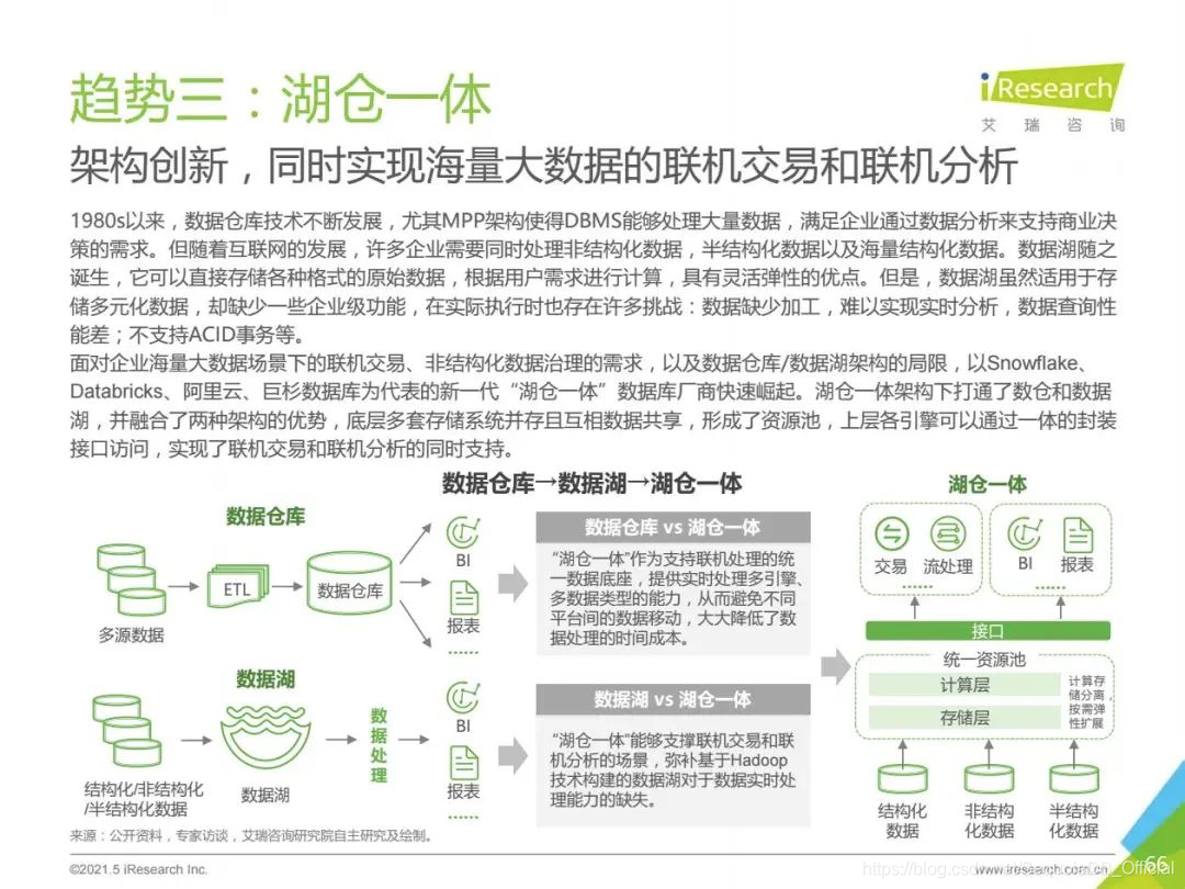 艾瑞咨询发布《2021年中国数据库行业研究报告》,可同时实现海量大数据联机交易和联机分析的「湖仓一体」创新架构成为数据库未来发展新趋势。