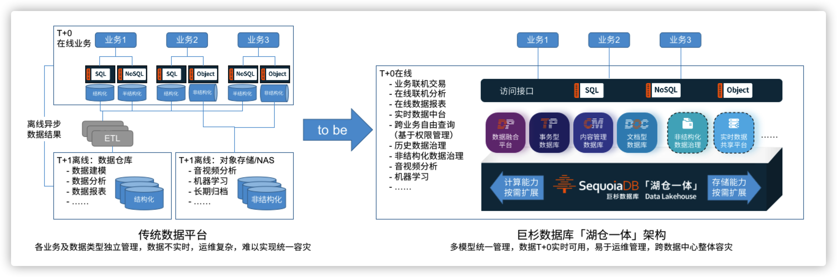 相比数据湖,巨杉数据库湖仓一体架构能够支撑联机交易和联机分析的场景,弥补了通过Hadoop技术在数据库实时处理能力方面的重大不足。随着企业数字化转型的深化,尤其是在数据中台、智能化应用进行微服务改造的过程中,企业内部出现了大量需要同时访问多个不同业务系统(几个到几百个)数据的联机交易场景,底层数据库具备大规模实时联机处理能力显得尤其重要。
