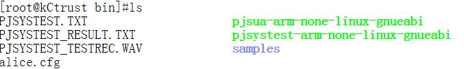 那些大写的文件是运行时产生的文件,不要管它们,alice.cfg是我添加的配置文件,也可以不添加,直接在命令行输入。pjsua-arm-none-linux-gnueabi就是交叉编译后生产的PJSUA可执行文件,pjsystest-arm-none-linux-gnueabi是交叉编译后生产的检测系统硬件的可执行文件,samples文件夹里面包含了其他例程交叉编译后的可执行文件。
