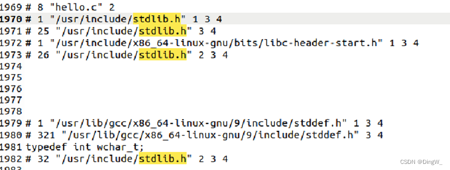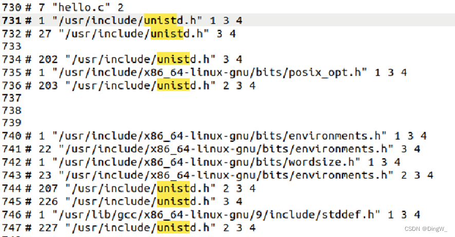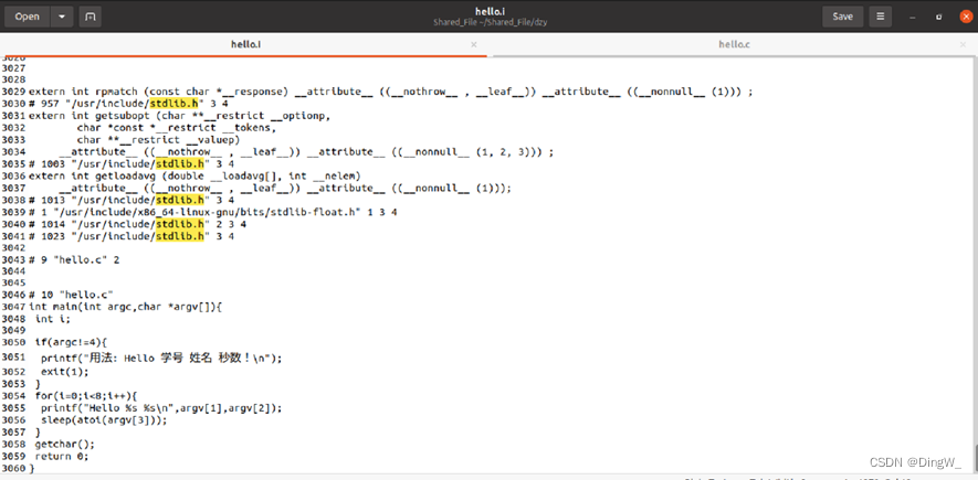 2.3.1预处理后的hello.i文件对宏定义进行了展开,调用了对应.h头文件,如下图: