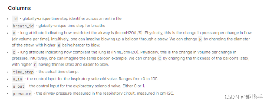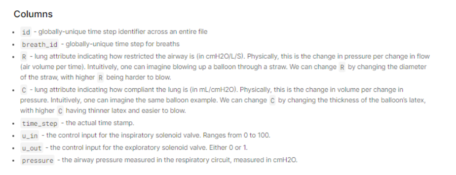 本次比赛中使用的呼吸机数据是通过一个呼吸回路连接到一个人工风箱测试肺的改良开源呼吸机产生的。下图展示了设置,两个控制输入用绿色突出显示,要预测的状态变量(气道压力)用蓝色显示。第一个控制输入是一个从0到100的连续变量,代表吸气电磁阀打开以让空气进入肺的百分比(即,0完全关闭,没有空气进入,100完全打开)。第二个控制输入是一个二进制变量,表示探索性阀门是开启(1)还是关闭(0)以排出空气。在这个比赛中,参与者将被给予无数次时间序列的呼吸,并将学习在给定控制输入的时间序列的情况下,预测呼吸过程中呼吸回路中的气道压力。每个时间序列代表大约3秒的呼吸。这些文件被组织起来,每一行都是呼吸中的一个时间步骤,并给出两个控制信号,由此产生的气道压力和肺的相关属性,如下所述。