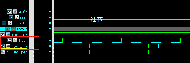 在仿真中,用一个输出时钟与输入时钟的与门来反应时钟移相是否成功(只能用来协助仿真),不可用来综合应用;