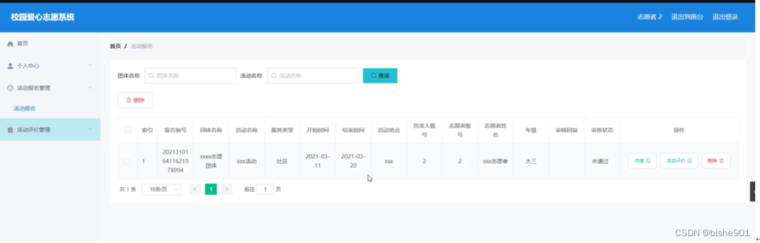 活动报名管理,在活动报名管理页面中可以查看索引、报名编号、团体名称、活动名称、服务类型、开始时间、结束时间、活动地点、负责人账号、志愿者账号、志愿者姓名、年级、审核回复、审核状态等信息内容进行详情,活动评价或删除等其他详细操作,如图4-6所示。