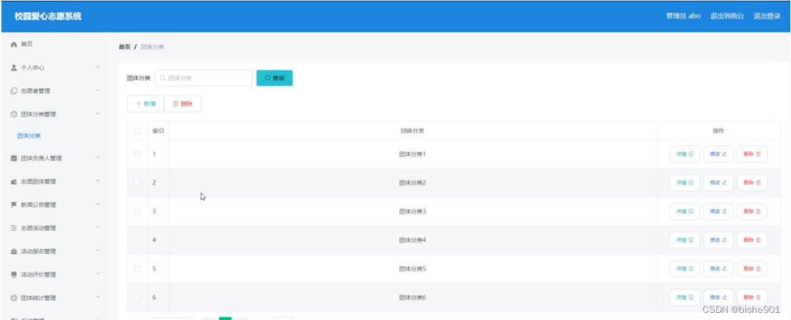 团体分类管理,在团体分类管理页面中可以对索引、团体分类等信息进行详情,修改或删除等操作,如图4-10所示。