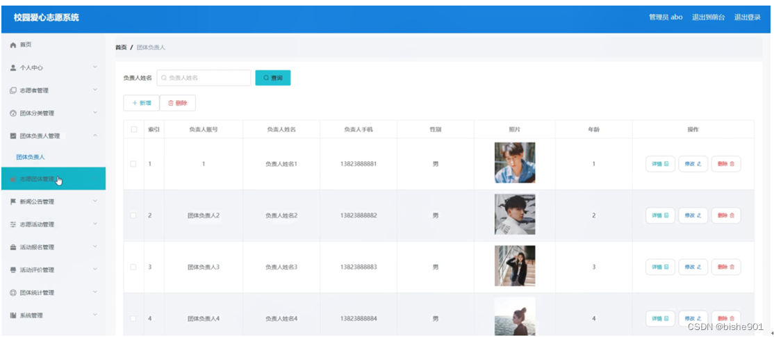 团体负责人管理,在团体负责人管理页面中可以对索引、负责人账号、负责人姓名、负责人手机、性别、照片、年龄等信息进行详情,修改或删除等操作,如图4-11所示。