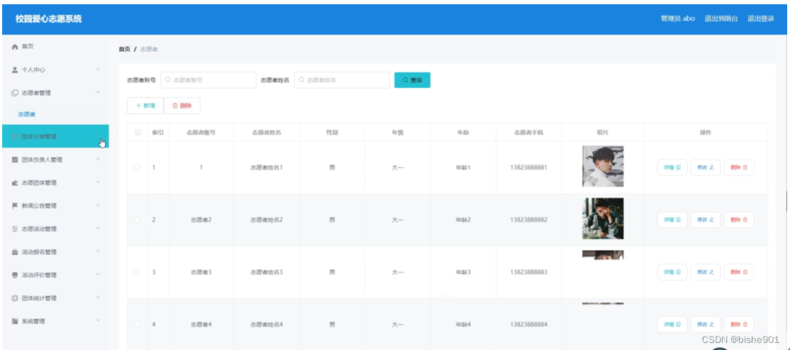 志愿者管理,在志愿者管理页面中可以对索引、志愿者账号、志愿者姓名、性别、年终、年龄、志愿者手机、照片等信息进行详情,修改或删除等操作,如图4-9所示。
