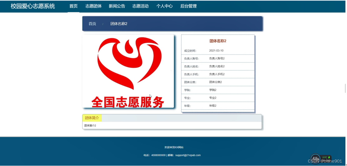 志愿团体,在志愿团体页面可以查看团体名称、成立时间、图片、负责人账号、负责人姓名、负责人手机、团体分类、学院、专业、年级、团体简介等详细内容,如图4-2所示。