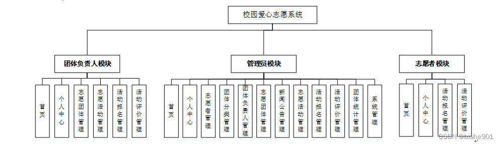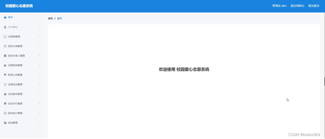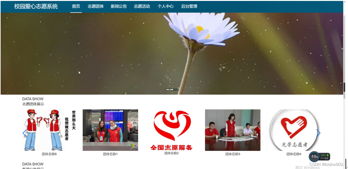 校园爱心志愿系统,在系统首页可以查看首页、志愿团体、新闻公告、志愿活动、个人中心、后台管理等内容,如图4-1所示。