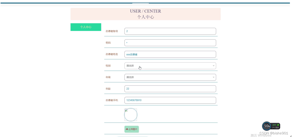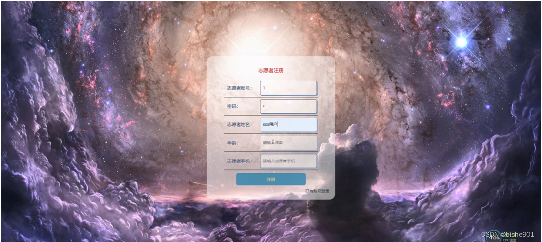 志愿者注册,在志愿者注册页面通过填写志愿者账号、密码、志愿者姓名、年龄、志愿者手机等信息完成注册,如图4-3所示。在个人中心页面通过填写志愿者账号、密码、志愿者姓名、性别、年级、年龄、志愿者手机、图片等信息进行更新操作,如图4-4所示。
