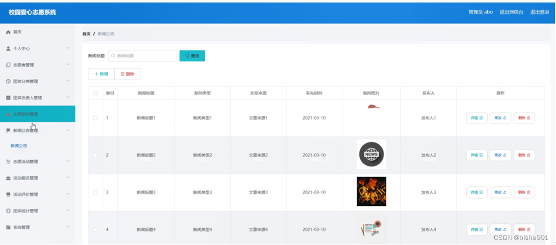 新闻公告管理,在新闻公告管理页面中可以对索引、新闻标题、新闻类型、文章来源、发布时间、新闻图片、发布人等信息进行详情,修改或删除等操作,如图4-13所示。