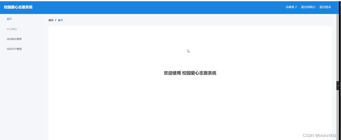 志愿者登录进入系统后台可以查看首页、个人中心、活动报名管理、活动评价管理等内容进行详细操作,如图4-5所示。