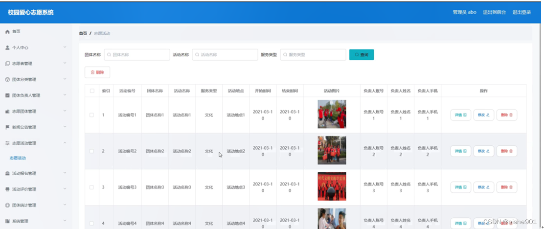 志愿活动管理,在志愿活动管理页面中可以对索引、活动编号、团体名称、活动名称、服务类型、活动地点、开始时间、结束时间、活动图片、负责人账号、负责人姓名、负责人手机等信息进行详情,修改或删除等操作,如图4-14所示。