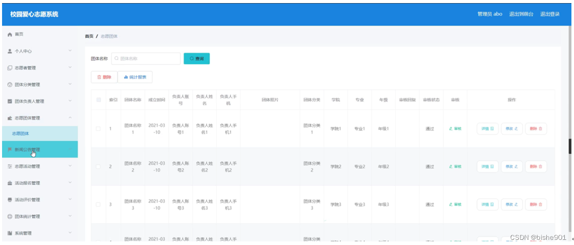 志愿团体管理,在志愿团体管理页面中可以对索引、团体名称、成立时间、负责人账号、负责人姓名、负责人手机、团体照片、团体分类、学院、专业、年级、审核回复、审核状态、审核等信息进行详情,修改或删除等操作,如图4-12所示。