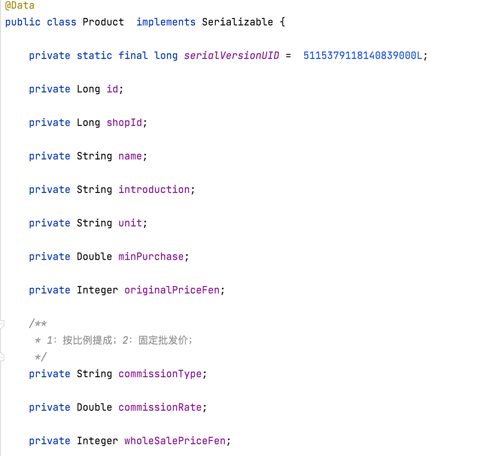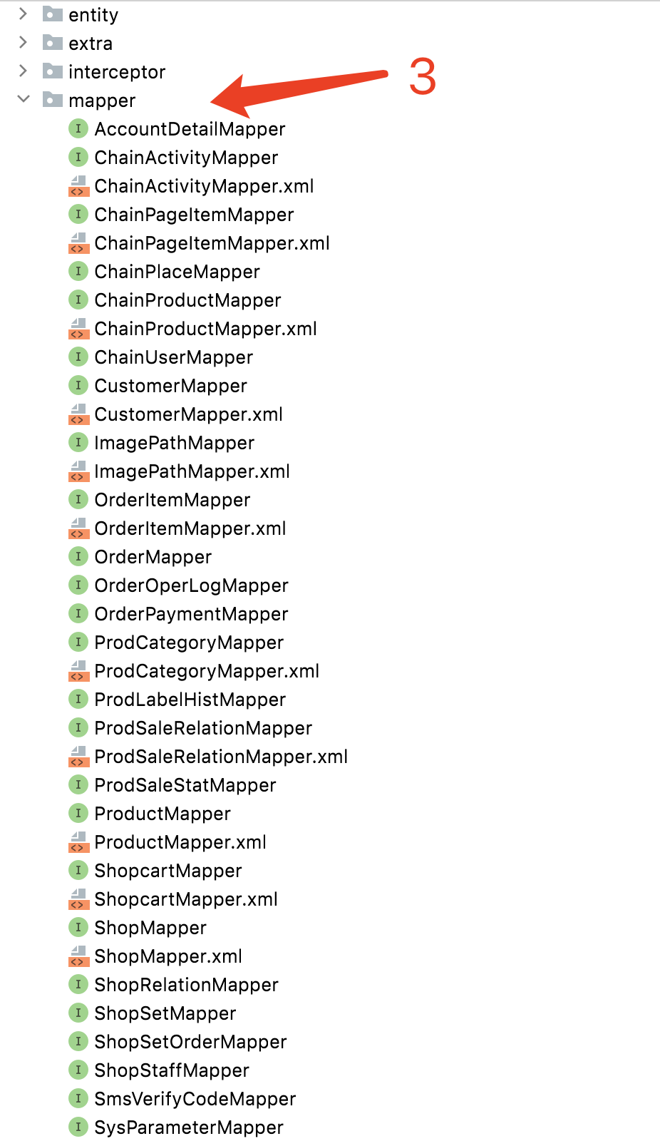 - 标号 2 位置:这里放的是 entity(数据 bean)层代码,其实都是 POJO 代码,所有类都一一对应到数据库表。一般来说,这里的代码都长成这样: