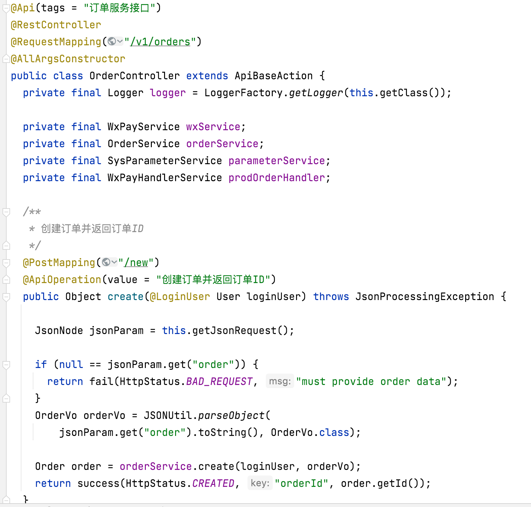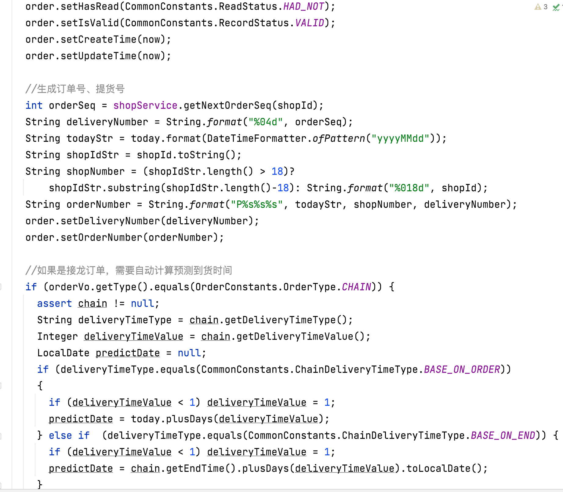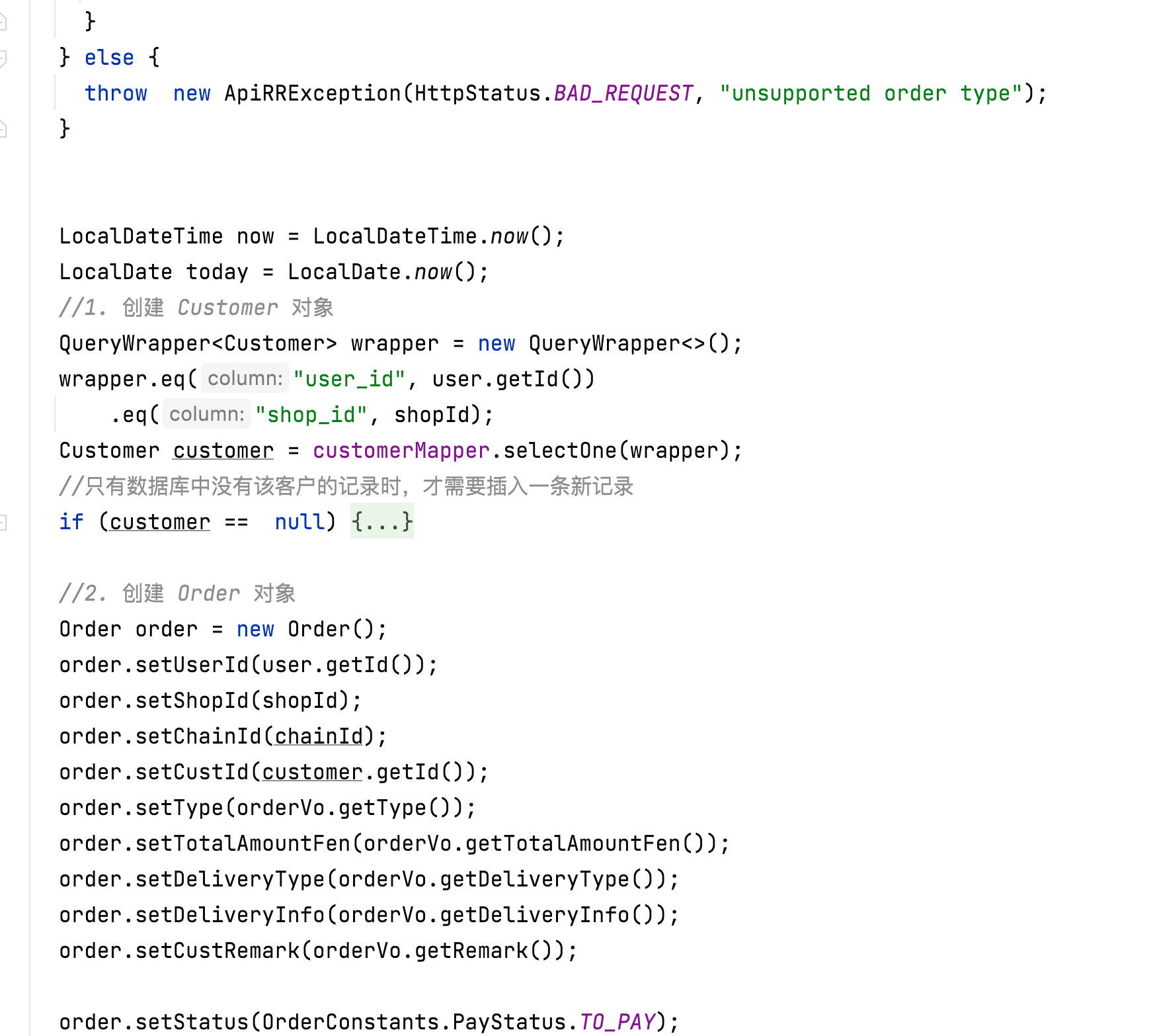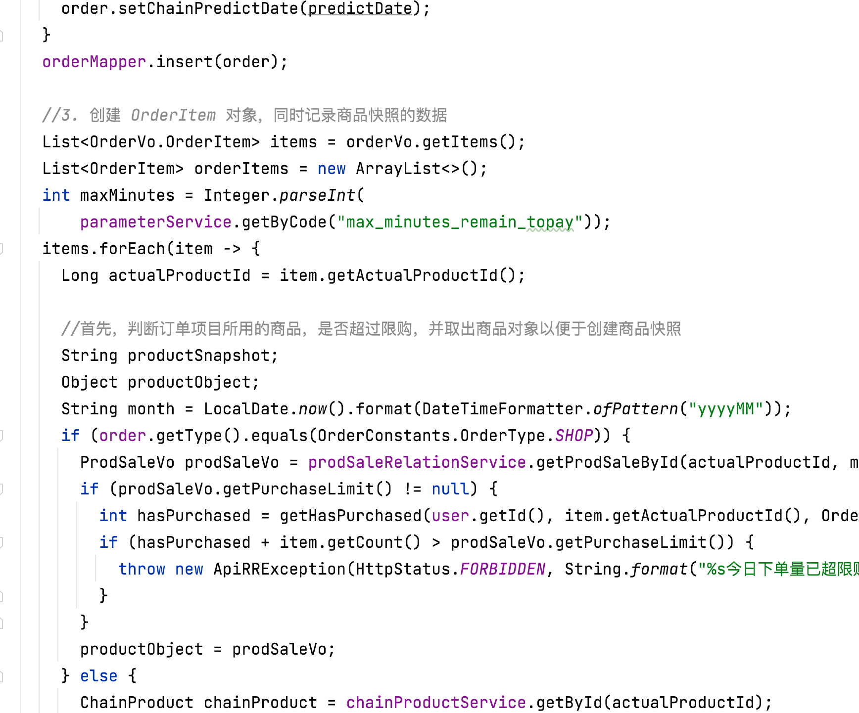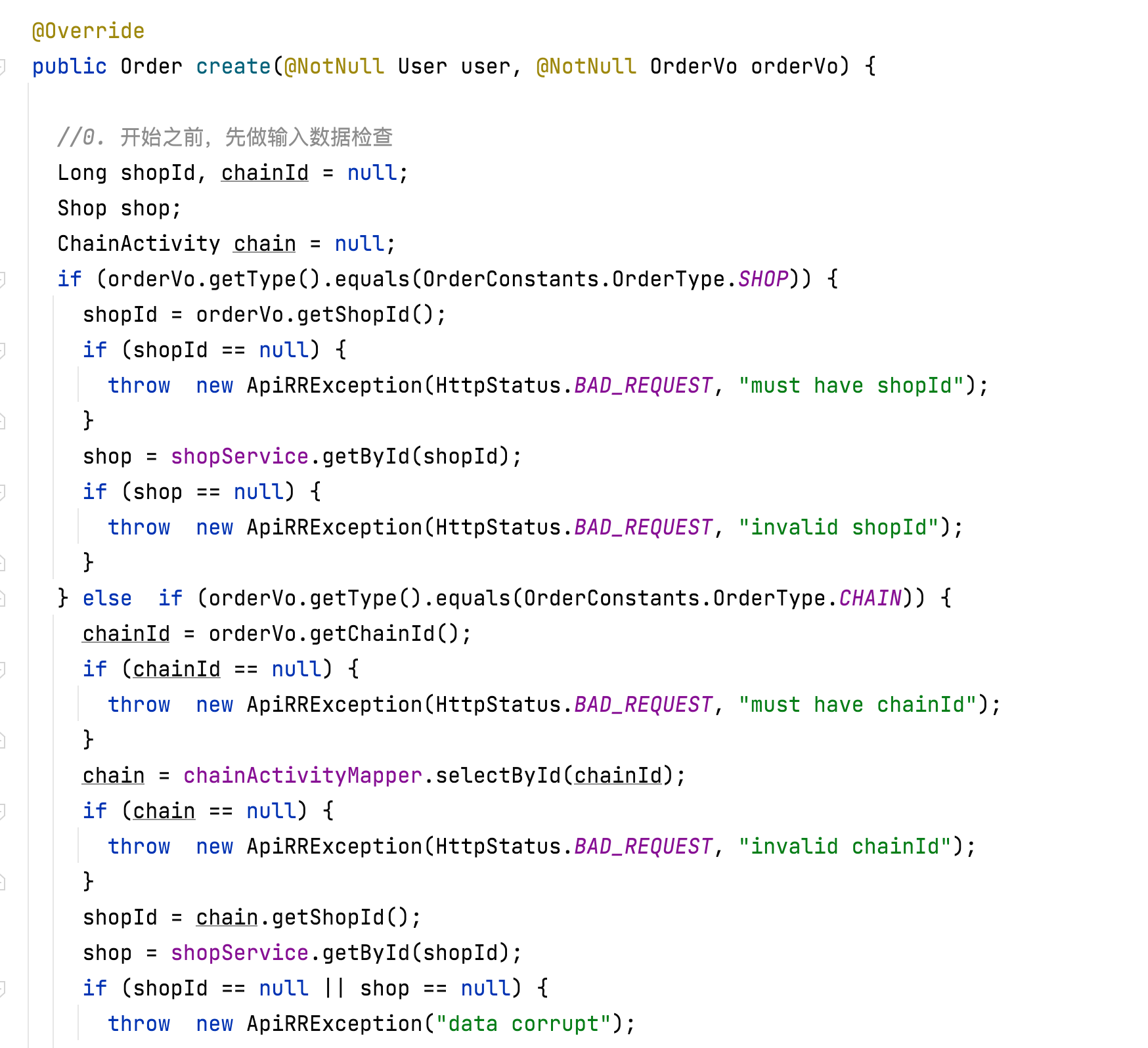 - Service 层实现类代码的逻辑写的很长,且完全是“平铺直述”的。我这里展示的 OrderSeriveImple 的 create 方法——创建订单,就写了 135 行。从我的代码截图中的注释可以看出来,我是想好了一步一步要怎么对数据库进行 CRUD,先填写好注释,然后写代码的。这种代码,说白了就是“CRUD+计算逻辑”组合的代码;