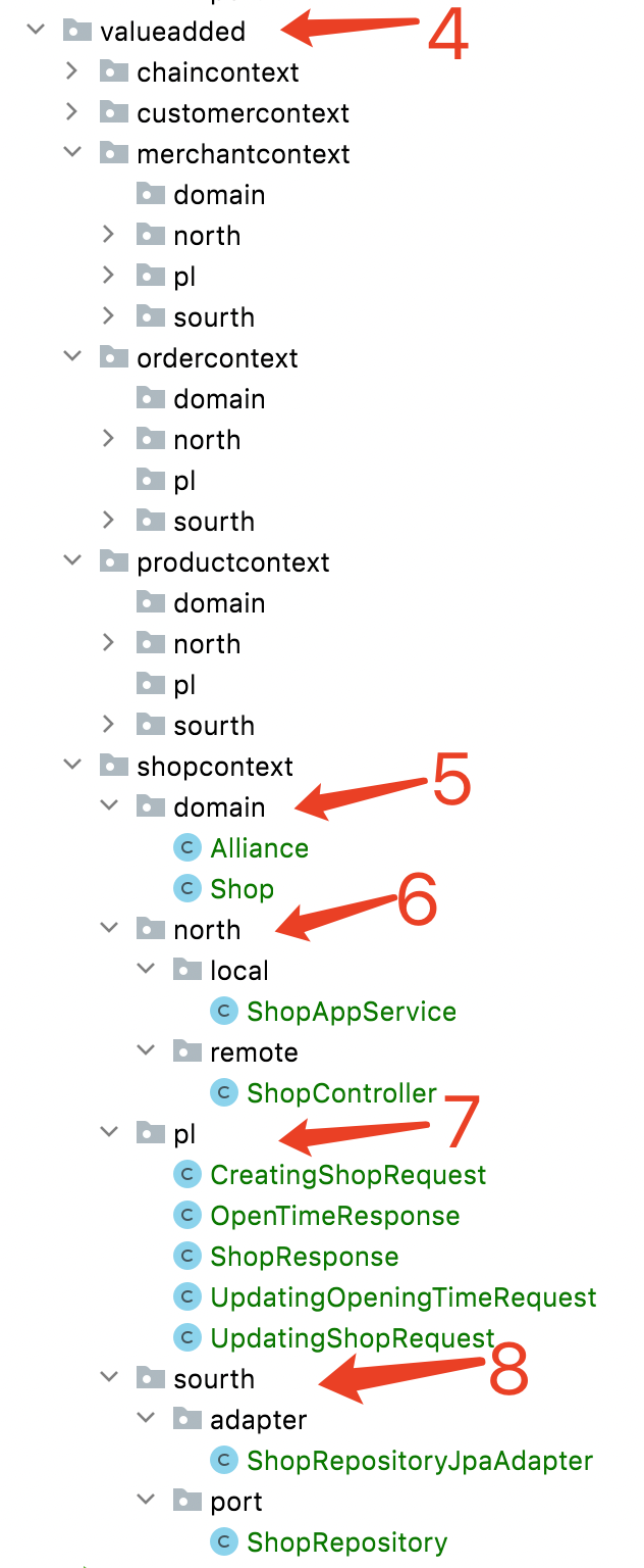 我们再来看看使用 DDD 设计后,新的代码结构长什么样。下面是新代码的结构截图(同样注意下面的 1~8 标号):