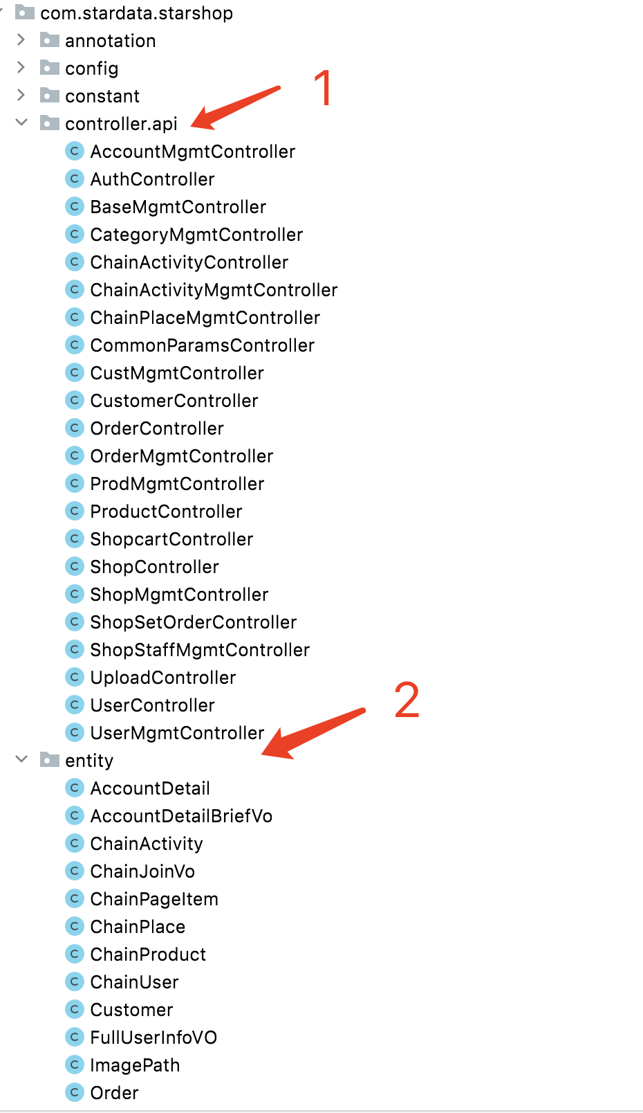 - 标号 1 位置:这里放的是 Controller(控制器)层代码,也就是所有前端访问的接口都在这里实现。按照 MVC 的分层原则,一般来说,这里只会放一些客户端输入参数的解析、以及对 service 层(见下文)的业务方法调用。一般来说,这里的代码都长成下面这样: