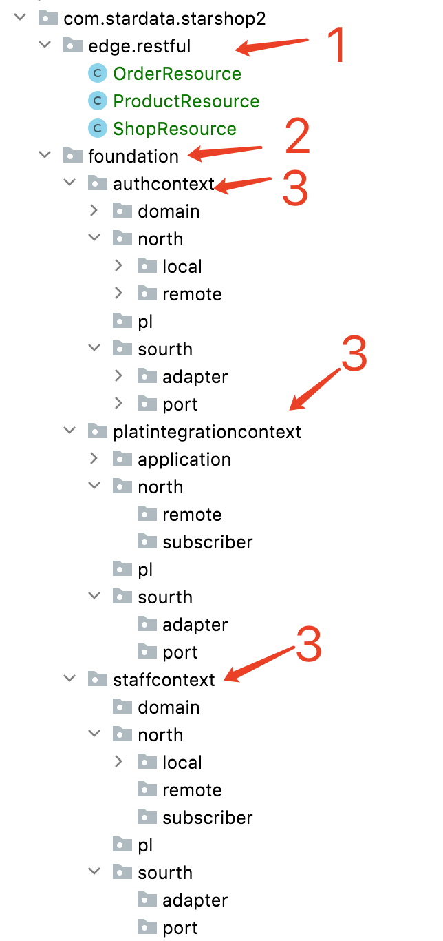 - 标号 3 位置:这里显示了多个限界上下文,都是以 xxxcontext 这样的目录取名。在“基础层”和“业务价值层”中,都会出现多个“限界上下文”。每个限界上下文可以分离到不同的项目团队去负责、甚至分离到不同的微服务中心中。还是那句话,现在你还不用太深入的理解“限界上下文”,暂时只需要理解它是一种模块划分的说法就好(后面会逐步深入解释)。